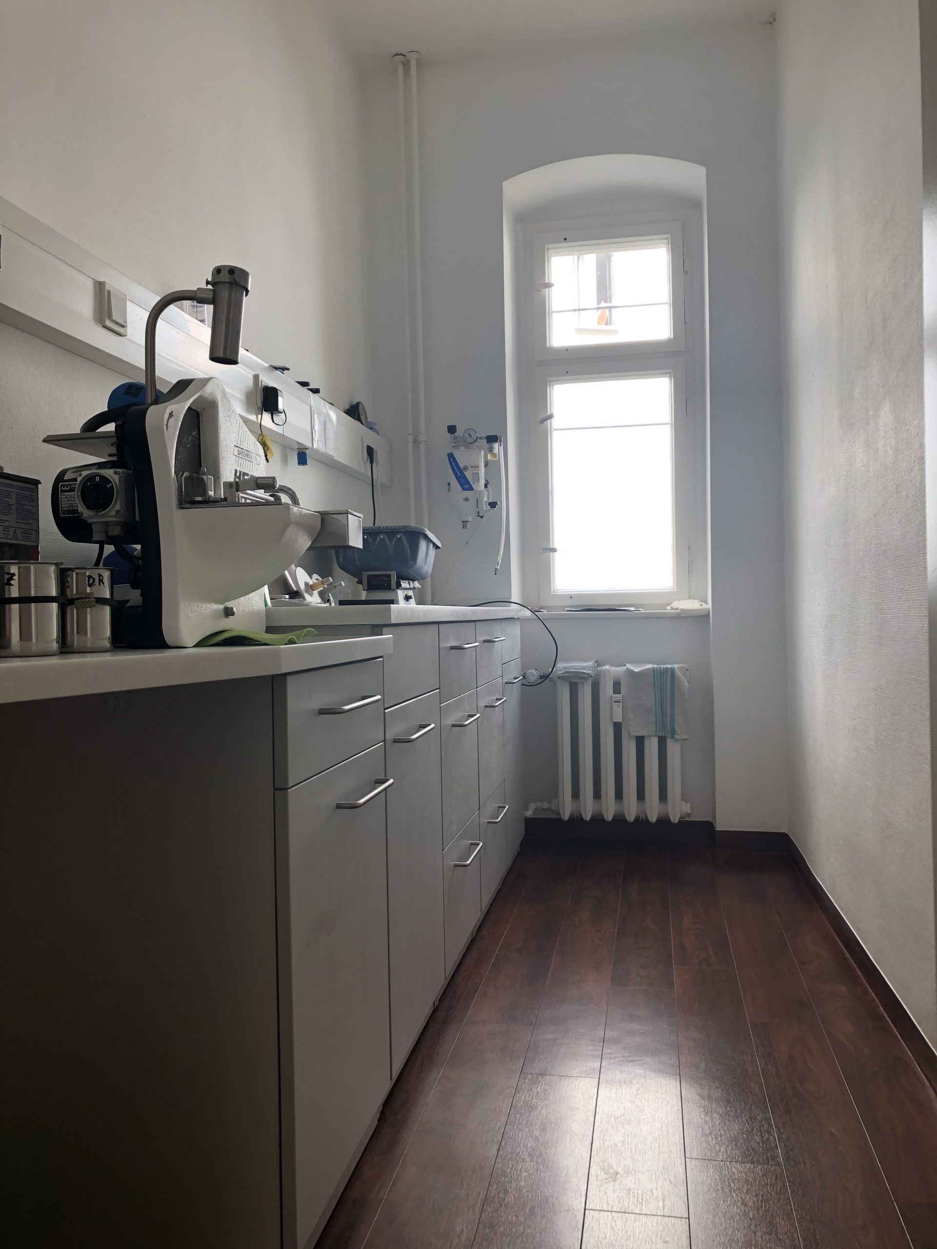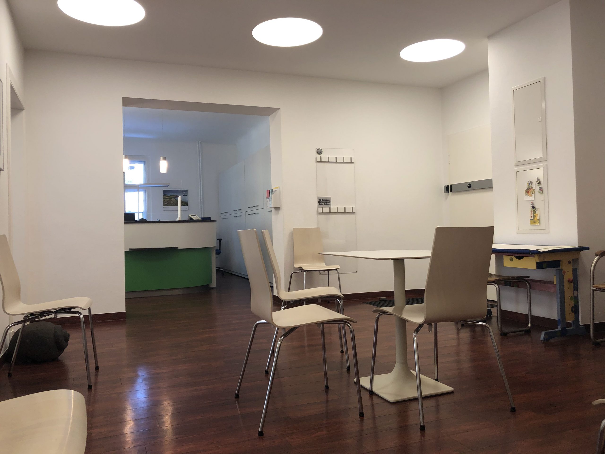 - Zimmer: 2 Behandlungszimmer, 1 Raum Rezeption/Büro, 1 Aufbereitungs-/Röntgenraum, 1 Wartezimmer, 1 Labor, 1 Gipsraum, 1 Mundhygiene/Patiententoilette, 1 Sozialraum, 1 Personaltoilette